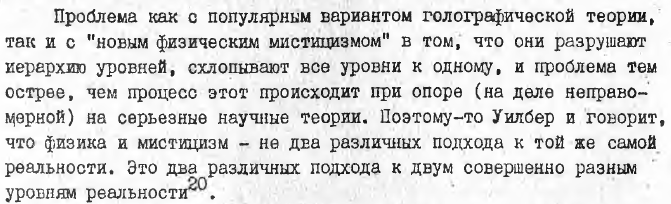 «Проблема как с популярным вариантом голографической теории, так и с „новым физическим мистицизмом“ в том, что они разрушают иерархию уровней, схлопывают все уровни к одному, и проблема тем острее, чем процесс этот происходит при опоре (на деле неправомерной) на серьёзные научные теории. Поэтому-то Уилбер и говорит, что физика и мистицизм — не два различных подхода к той же самой реальности. Это два различных подхода к двум совершенно разным уровням реальности»